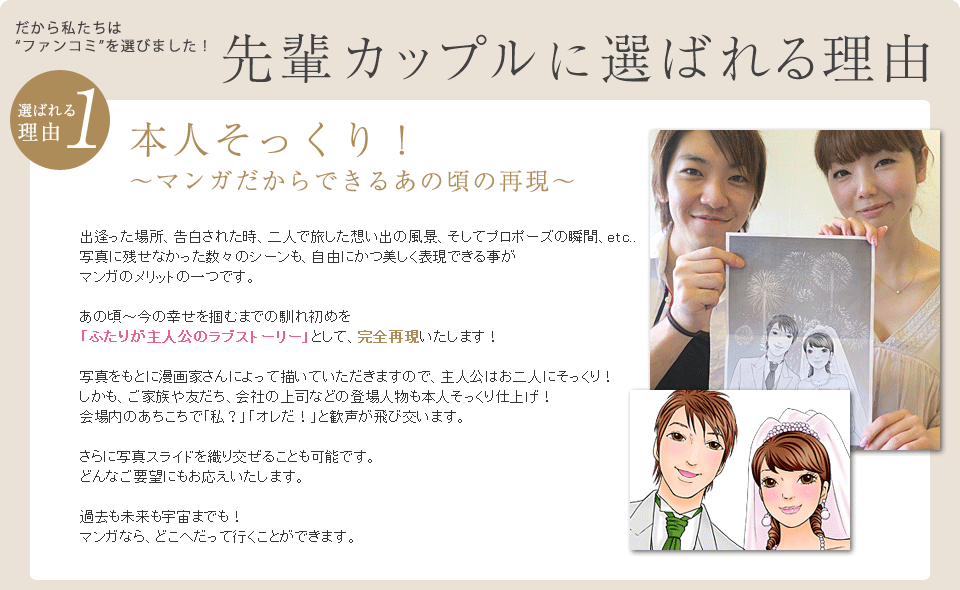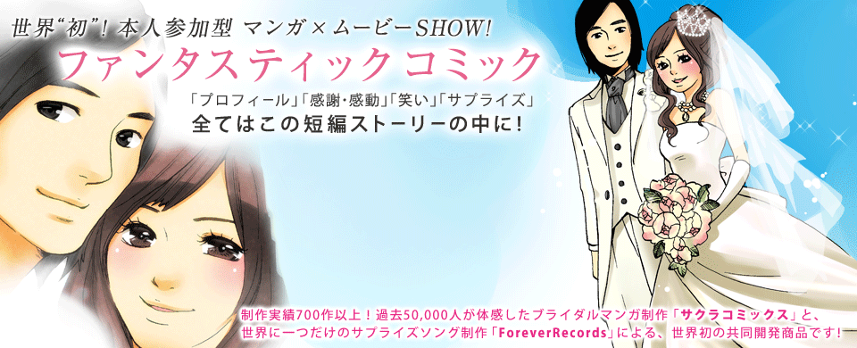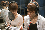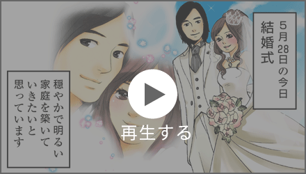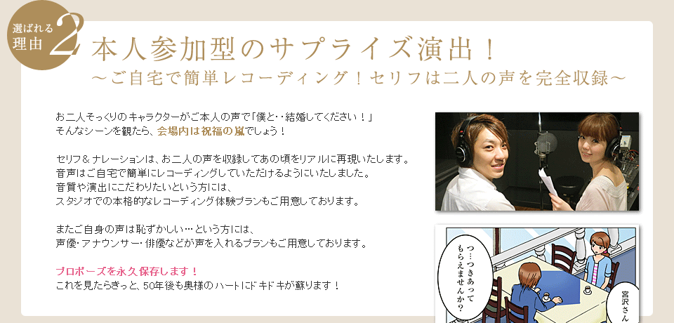 | 新婦役としてフリーアナウンサーさん、新郎役として某劇団所属の役者さんに声の出演をしていただきました。さすがはプロ。声だけで臨場感を作り出します! | こちらは、ご本人様出演による作品です。レコーディングは緊張ぎみでしたが、途中からお二人ともノリノリに!「もう一度君にプロポーズ」リアルに再現してました! |