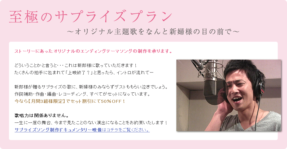 Copyright © Since2012 サプライズソング制作 ForverRecords All Rights Reserved. 当ページに掲載しているコンテンツや画像の再利用(再転載・配布など)は、禁止しています。